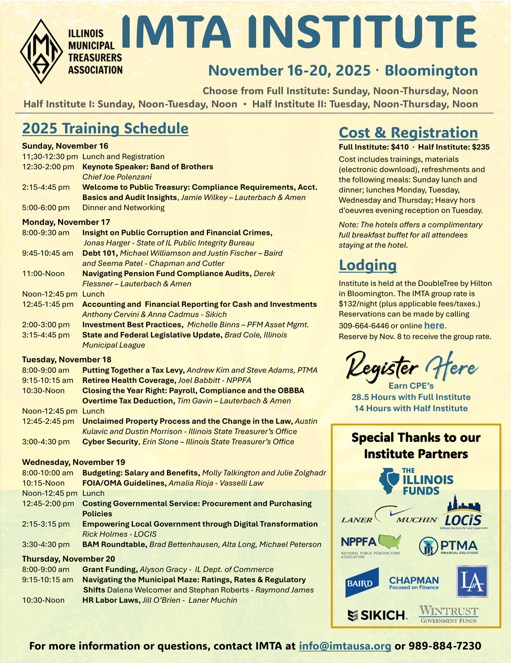 The Institute program is the core of IMTA's educational programs. Held every November, this four-day learning experience is a must-have for any treasury professional who wants to gain all the skills necessary to do their job. Established in 1981, the program is designed to accommodate the certification requirements of both our state certification, the CIMT, and the national CPFA administered by APT US&C. The curriculum of Institute is developed in cooperation with the national Association of Public Treasurers of the United States and Canada (APT US&C) to ensure a wide array of topics are addressed.